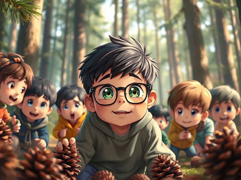 „Teraz” – powiedział z ekscytacją Boluś – „Niech każdy weźmie jedną szyszkę i kto bliżej dorzuci do kamienia, ten wygrywa!”.