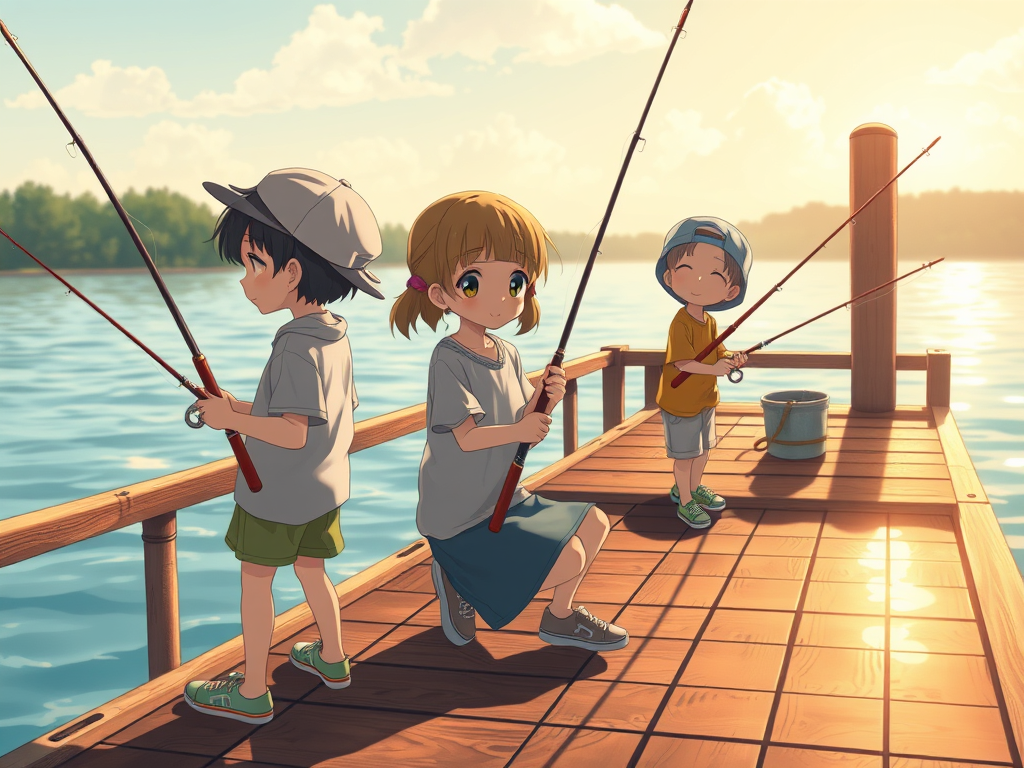 Na pomoście dzieci zajęli wybrane przez siebie miejsce i rozłożyli sprzęt do łowienia. Chłopcom włączyła się żyłka rywalizacji więc postanowili łowić na dwie wędki. Rodzice rozsiedli się na polance koło pomostu i bacznie przyglądali się im z brzegu, ciesząc się ich pomysłowością i zaangażowaniem.